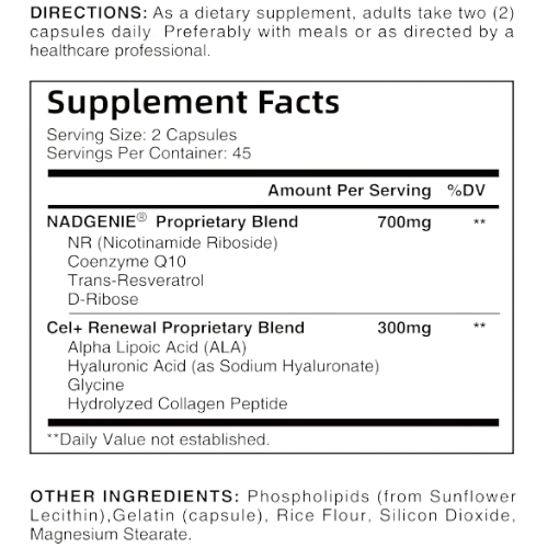 Formulated with Nicotinamide Riboside (NR), Trans-Resveratrol, Collagen Peptides, and Hyaluronic Acid, this high-performance blend promotes visible skin rejuvenation, deep hydration, and improved elasticity.