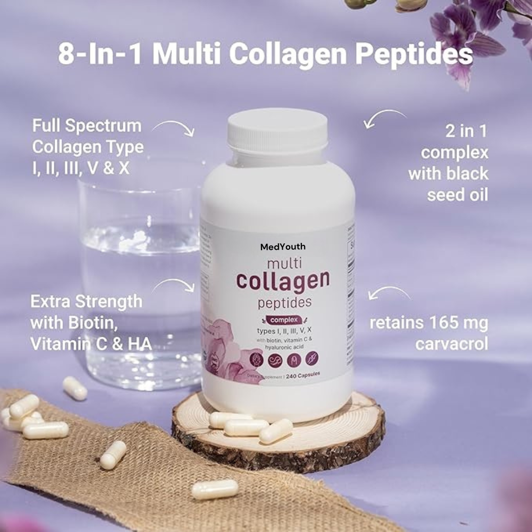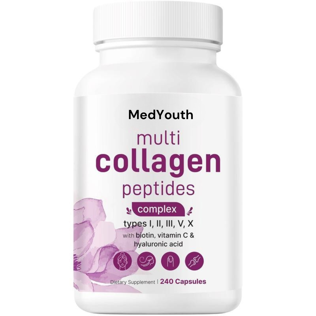 Our MedYouth Advanced Multi Collagen Complex is packed with 5 types of collagen plus biotin, hyaluronic acid, and vitamin C to restore youthful skin, strengthen hair, support joints, and revitalize your entire body from within.