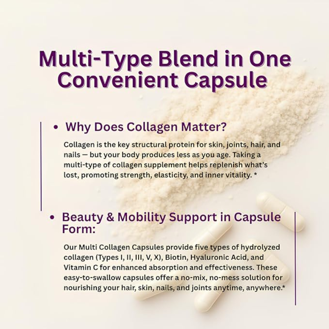 Whether you're struggling with brittle nails, thinning hair, aging skin, or joint discomfort, our Advanced Multi Collagen Complex delivers powerful nourishment your body deserves: